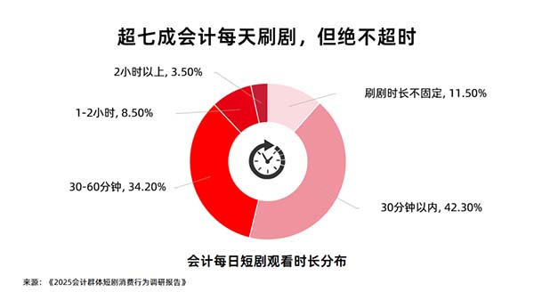 對于經(jīng)常需要處理復雜賬目、嚴守時間節(jié)點的會計人來說,時間觀念已經(jīng)深入骨髓。這種職業(yè)特性也完美體現(xiàn)在他們的短劇觀看習慣中。讓人驚訝的是,會計人群的短劇觀看率高達76.5%,堪稱短劇市場的“隱形主力軍”。但更讓人驚嘆的是他們的時間控制能力——就連看劇都要嚴格計時!