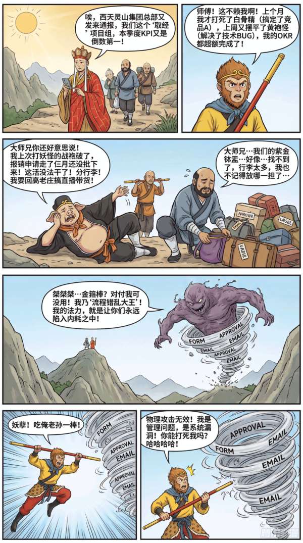 明明孫悟空是超一流的業(yè)務(wù)骨干(打怪能力S+),沙僧勤勤懇懇(執(zhí)行力高),但整個團隊卻被報銷不批、行李丟失、預(yù)算超支、效率低下等“內(nèi)耗”問題拖垮。