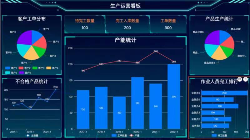生產(chǎn)看板支持趨勢(shì)圖、餅圖、指標(biāo)卡、排行榜等多種可視化數(shù)據(jù)展示樣式,也預(yù)置了多套精美皮膚供選擇,自定義的看板可發(fā)布為菜單,單獨(dú)授權(quán)給老板、廠長(zhǎng)、車(chē)間、庫(kù)管、品控等多用戶(hù)角色使用, 看板支持在大屏、電腦端、工控機(jī)、車(chē)間電視等多端展示。