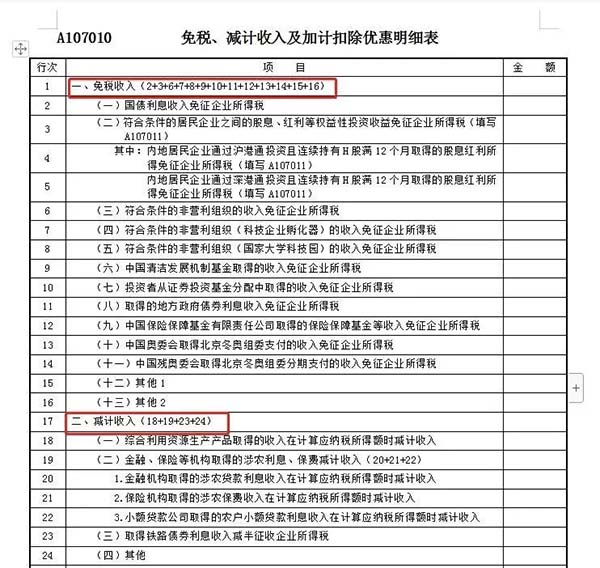 如有免稅收入和減計(jì)收入,務(wù)必認(rèn)真填寫A107010《免稅、減計(jì)收入及加計(jì)扣除優(yōu)惠明細(xì)表》以及附表。