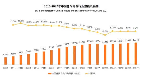 市場規(guī)模增長:中國休閑食品行業(yè)市場規(guī)模從2010年的4100億元增至2022年的11654億元,預(yù)計(jì)2027年將達(dá)到12378億元。