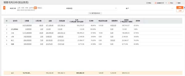 通過后臺(tái)可以清楚地知道交易次數(shù)、銷售金額、無稅金額、成本金額、毛利潤(rùn)、凈利潤(rùn)等,一張圖就能清晰知道每個(gè)客戶給公司帶來了多少毛利、多少凈利。
