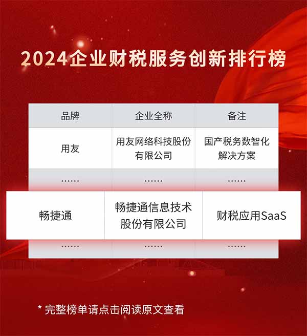 近日,由《互聯(lián)網周刊》、eNet研究院與德本咨詢聯(lián)合發(fā)布的“2024企業(yè)財稅服務創(chuàng)新排行榜”正式揭曉。暢捷通憑借其出色的產品創(chuàng)新能力和專業(yè)服務實力,連續(xù)三年入圍排行榜!這一榮譽不僅是對暢捷通在小微企業(yè)數(shù)智化服務領域深耕細作的充分認可,更凸顯了其在財稅云服務領域的持續(xù)領先地位。