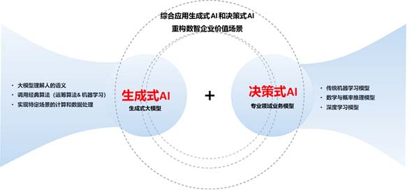 制造企業(yè)智能化落地應(yīng)用中,決策式AI與生成式AI如同“理性左腦”與“創(chuàng)新右腦”有機(jī)協(xié)同。前者以運(yùn)籌優(yōu)化、機(jī)器視覺(jué)構(gòu)建確定性決策體系,在排程、質(zhì)檢等場(chǎng)景沉淀工業(yè)機(jī)理;后者依托大模型突破經(jīng)驗(yàn)邊界,驅(qū)動(dòng)工藝創(chuàng)新與知識(shí)重構(gòu)。二者形成“決策執(zhí)行+知識(shí)反哺”的增強(qiáng)循環(huán):決策AI為生成模型提供場(chǎng)景化數(shù)據(jù)燃料,生成式AI為決策系統(tǒng)注入動(dòng)態(tài)優(yōu)化能力。
