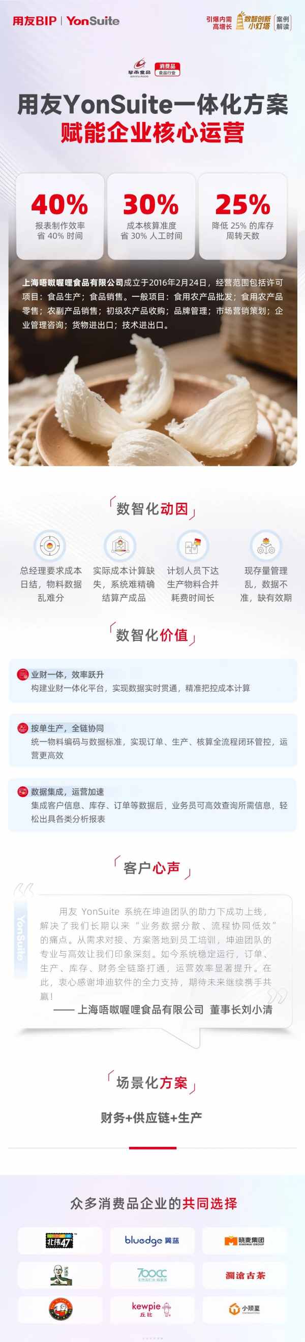 “用友 YonSuite 系統(tǒng)在坤迪團(tuán)隊(duì)的助力下成功上線,解決了我們長(zhǎng)期以來(lái)‘業(yè)務(wù)數(shù)據(jù)分散、流程協(xié)同低效’的痛點(diǎn)。從需求對(duì)接、方案落地到員工培訓(xùn),坤迪團(tuán)隊(duì)的專業(yè)與高效讓我們印象深刻。如今系統(tǒng)穩(wěn)定運(yùn)行,訂單、生產(chǎn)、庫(kù)存、財(cái)務(wù)全鏈路打通,運(yùn)營(yíng)效率顯著提升。在此,衷心感謝坤迪軟件的全力支持,期待未來(lái)繼續(xù)攜手共贏!”上海唔呶喔哩食品有限公司董事長(zhǎng)劉小清的這番話語(yǔ),不僅是對(duì)用友 YonSuite 數(shù)智化價(jià)值與坤迪團(tuán)隊(duì)服務(wù)的高度認(rèn)可,更彰顯了上海唔呶喔哩食品主動(dòng)擁抱變革、追求高質(zhì)量發(fā)展的堅(jiān)定決心。通過(guò)此次數(shù)智化轉(zhuǎn)型,企業(yè)不僅解決了成本、物料、庫(kù)存的傳統(tǒng)難題,更構(gòu)建了數(shù)據(jù)驅(qū)動(dòng)的運(yùn)營(yíng)體系,為業(yè)務(wù)拓展與市場(chǎng)競(jìng)爭(zhēng)筑牢了數(shù)字底座。