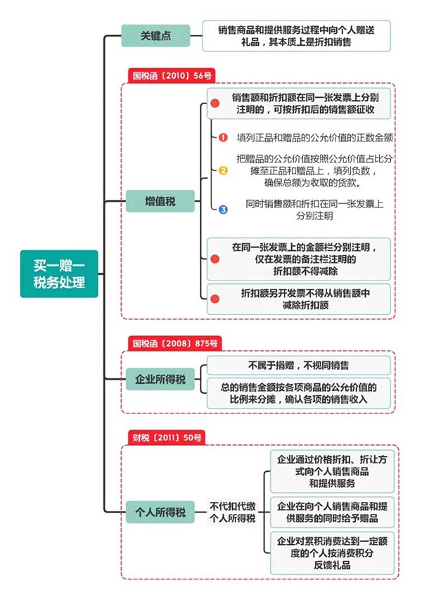 一種處理方式是,“買一贈一”屬于折扣銷售。比如(四川省國家稅務局公告2011年第6號)規(guī)定:“買物贈物”方式,是指在銷售貨物的同時贈送同類或其他貨物,并且在同一項銷售貨物行為中完成,贈送貨物的價格不高于銷售貨物收取的金額。對納稅人的該種銷售行為,按其實際收到的貨款申報繳納增值稅,但應按照《國家稅務總局關于確認企業(yè)所得稅收入若干問題的通知》(國稅函〔2008〕875號)第三條的規(guī)定,在賬務上將實際收到的銷售金額,按銷售貨物和隨同銷售贈送貨物的公允價值的比例來分攤確認其銷售收入,同時應將銷售貨物和隨同銷售贈送的貨物品名、數(shù)量以及按各項商品公允價值的比例分攤確認的價格和金額在同一張發(fā)票上注明。