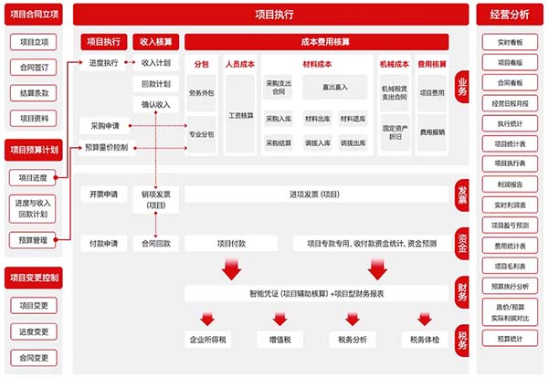 用友好業(yè)財(cái)融合飛書OA、多維表單等,為企業(yè)搭建項(xiàng)目合同管理一體化平臺(tái),為商務(wù)服務(wù)、建筑安裝、設(shè)備安裝、系統(tǒng)集成等行業(yè)提供服務(wù),涵蓋項(xiàng)目立項(xiàng)、預(yù)算管理、分包管理、材料采購、物料管理、人工管理、收入確認(rèn)、往來核算、利潤分析等核心場景。