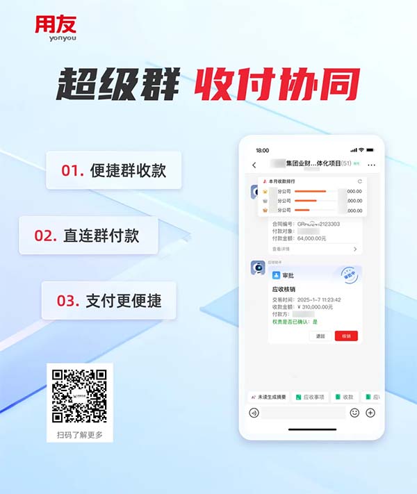 超級群為收付協(xié)同提供了全方位的解決方案。無論是收款還是付款,都可以在群內(nèi)輕松完成。連接上下游收付業(yè)務(wù)群,確額、直連、支付等一個群搞定。支持多種支付方式,確保交易便捷安全。同時,收付記錄實時同步至群內(nèi),讓團隊成員隨時了解收支情況,確保資金流的透明化管理,大大提升了企業(yè)財務(wù)收付管理的效率和準確性。